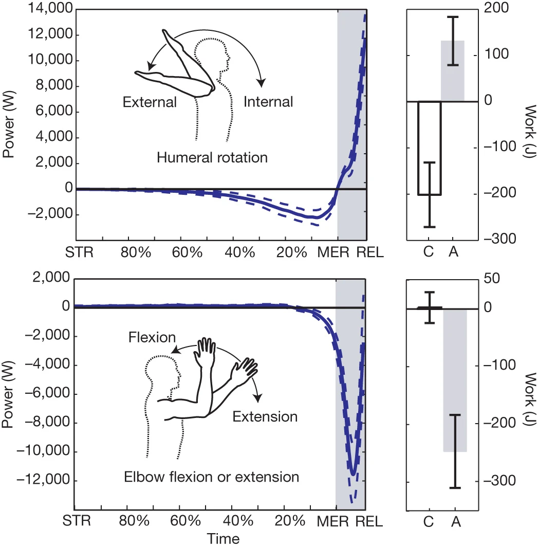 Blue lines: “Mean Shoulder Rotational Energy” — Roach, N., Venkadesan, M., Rainbow, M. et al. Elastic energy storage in the shoulder and the evolution of high-speed throwing in Homo . Nature 498, 483–486 (2013). https://doi.org/10.1038/nature12267